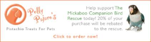 Polly Pajaro's Pistachio Treats Pistachios make great foraging treats! Use this link, and when you check out, type "Mickaboo" in the "special notes" field, and Polly Pajaro will donate 20% of your purchase to Mickaboo.