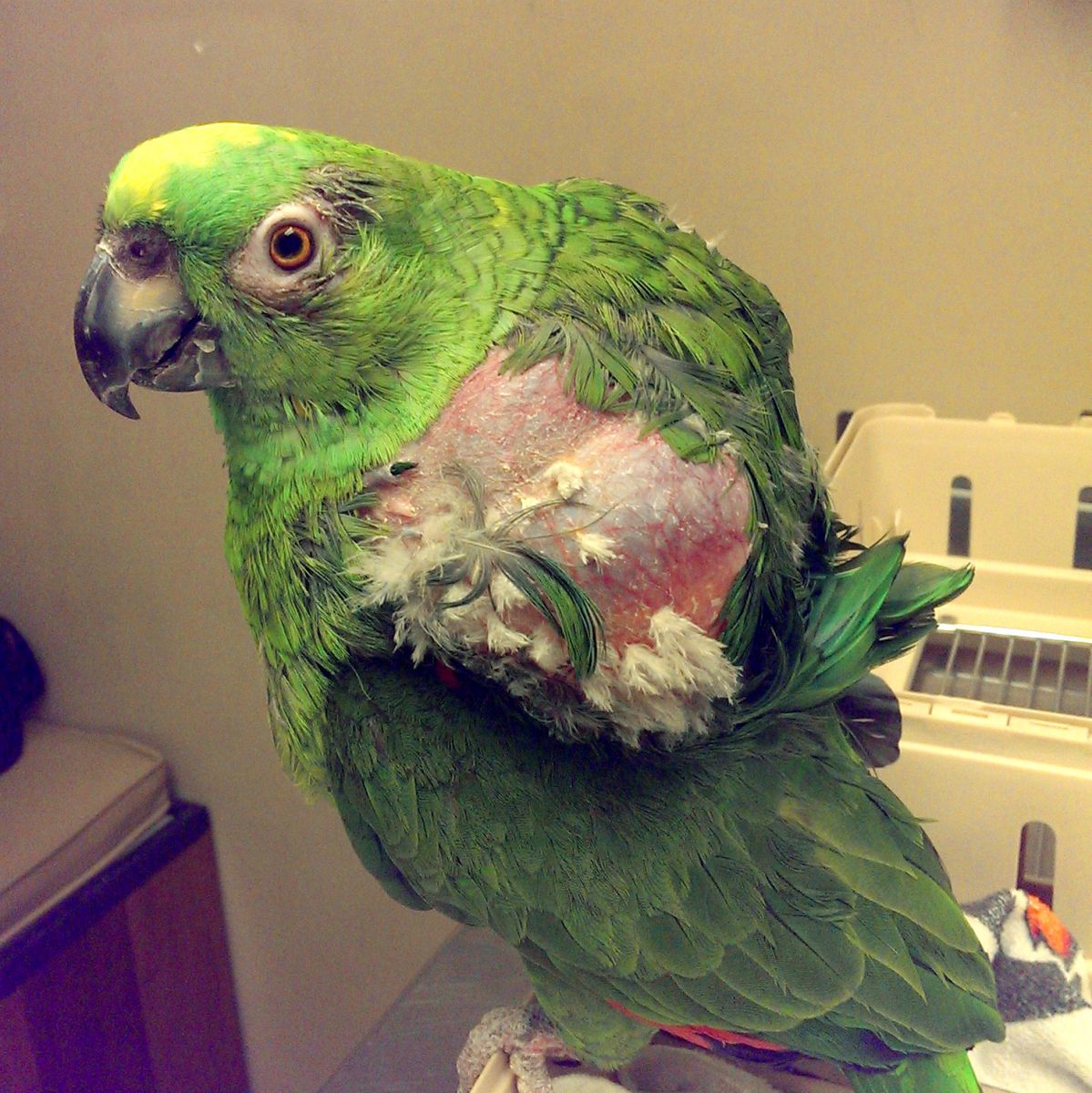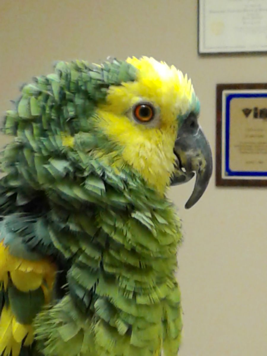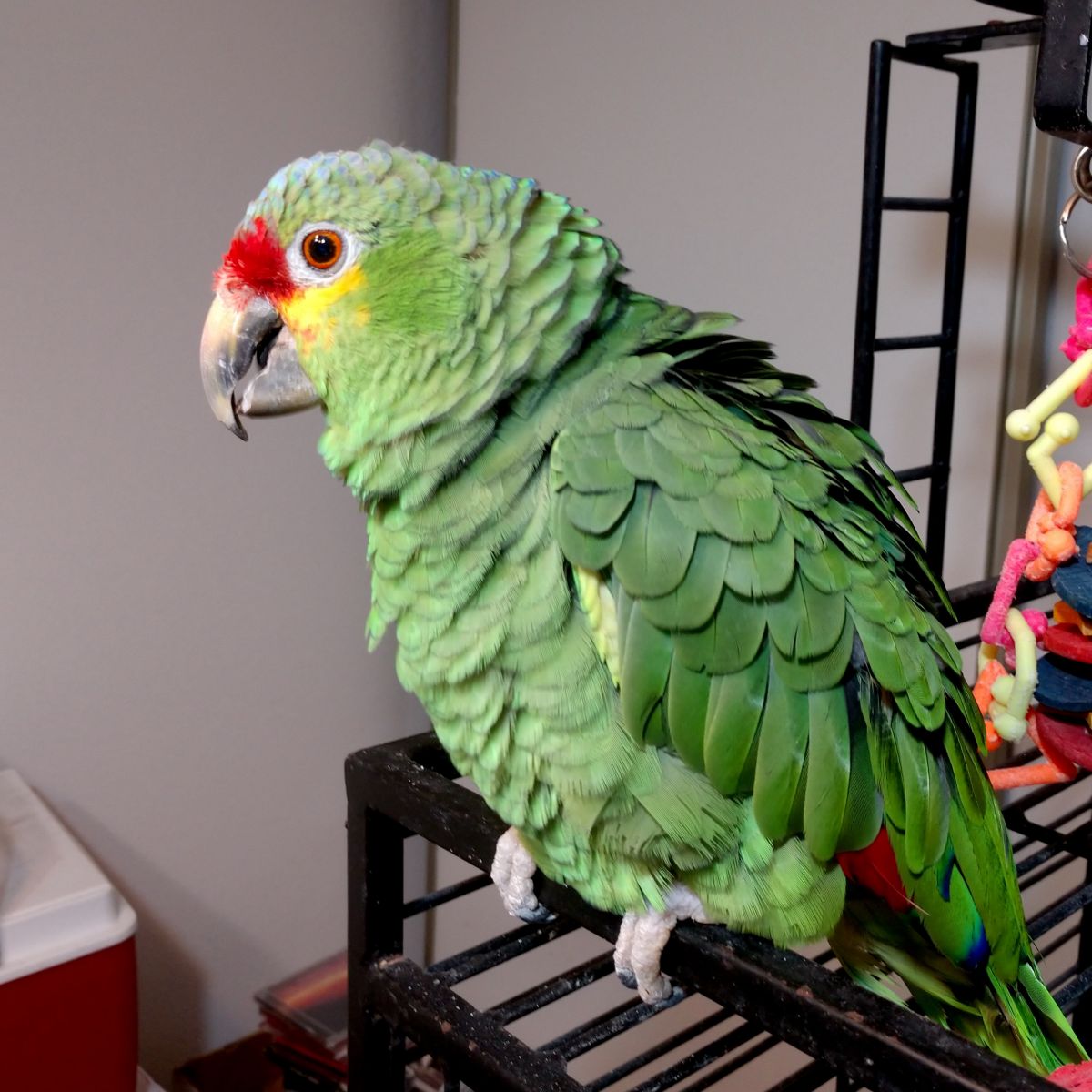 UPDATE: June 2020 --------- Charlie is so cute with his big amazon eyes that look up at you very sweetly. Despite his size, he is able to climb around his cage. He is afraid of hands but he steps up and allows head scratches when approached slowly. He loves to climb up your arm. Charlie talks very appropriately. He has said “Go away, go right now!” and calls for “Don”. He is eating a healthy diet of pellets and vegetables. Now Charlie looks a lot bigger than he is. He has air sacs under his skin that are not releasing air like they are supposed to. This can be caused by trauma. A thorough veterinary work up was done. There aren’t any underlying causes for the air sacs other than trauma. The air sacs were drained but they filled back up. The next step in treatment might place a stent between the air sacs so the air has a way to be released internally. We will know in the next few weeks. Angels for Charlie |