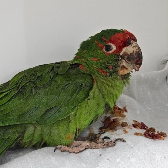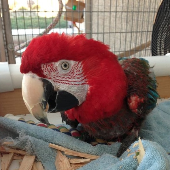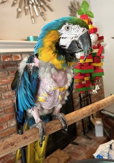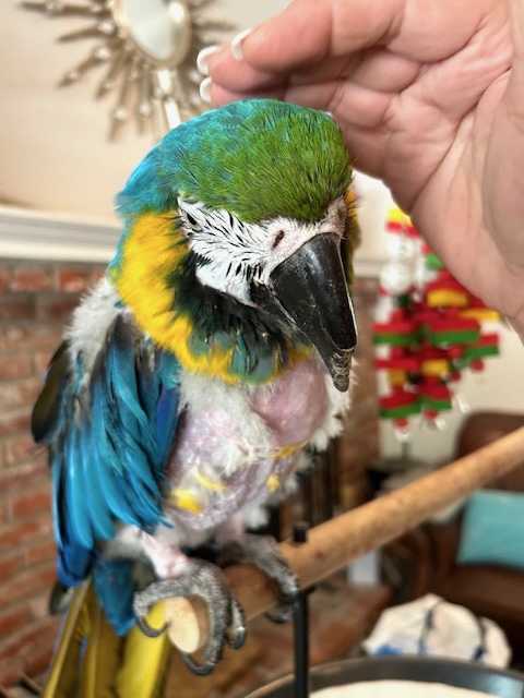 Gizmo had a home in California’s Central Valley for 25 years, where he was loved and cared for, but not thriving. Sharing a cage with another macaw named Tim, Gizmo had become hormonal and the pair were fighting. Gizmo suffered a beak wound and subsequent serious infection. His super-charged hormone condition also created issues in his gut, and he had very stinky poops. When Gizmo’s elderly parront became ill in 2022, a friend tried hard to visit daily to look after the pair, but it was evident they needed rescue. Gizmo and Tim’s human mom made the difficult decision to surrender the pair in June 2022, choosing to do what was best for them. Gizmo went directly into an avian veterinary hospital. (Tim was adopted.) The veterinarian treated Gizmo’s beak wound, which had become necrotic, as well as his hormone condition. Gizmo lived at the hospital and received care for nearly two years, until he was well enough to be released and a foster home became available. The beak treatments continue to this day, and his beak is healing well. He will need to receive periodic hormone injections long term, perhaps for life. He is thriving in foster home, friendly and gentle with his humans, and happy with the ambient company of his foster parront’s flock – in his own cage! No more sharing cages, for Gizmo. He loves to come out to a big playstand, jabber softly to his humans, and sit quietly on his foster mom’s arm to help her grade her students’ papers. Would you like to be the Angel for this gentle, sweet boy, assisting Mickaboo with his considerable veterinary expenses? |