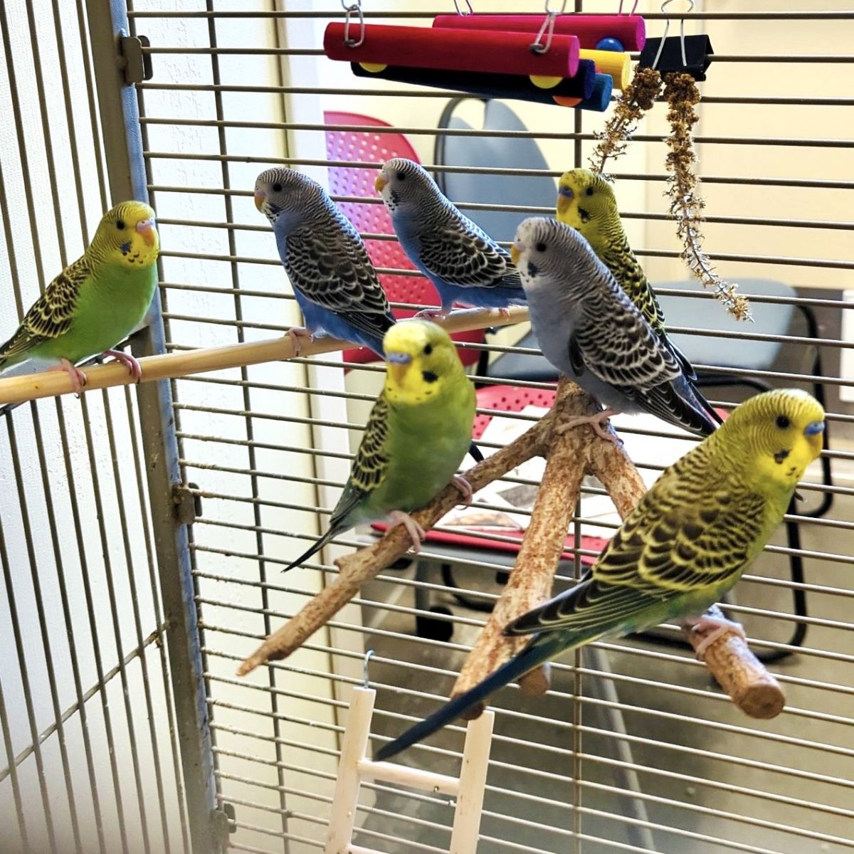 Hooray, some of this flock has been adopted! But, there are still several budgies that came in as surrenders that need forever homes. See all of them here: https://mickaboo.org/birds/parakeet --------- In the spring of 2022, seven male baby budgies were surrendered at the Santa Cruz Animal Shelter. Also, on the same day another baby budgie, who happened to be mostly white, was brought in. The shelter combined the baby with the other group of seven. Later at the vet's office, they named the group Snow White and the Seven Dwarves. Unfortunately, they all tested positive for Cladosporium and some of them had AGY (Avian Gastric Yeast - which causes inflammation in their digestive tract and makes them very sick). They’ve been at the vet for a couple of weeks being treated, and since they were so young they had to be carefully looked after and medicated. With all of the overnight care, testing, and medications, their vet bill has grown exorbitantly high. We are hoping to get them setup with foster homes as a few of them are ready. If you are able to help sponsor or foster, these cuties would very much appreciate it!