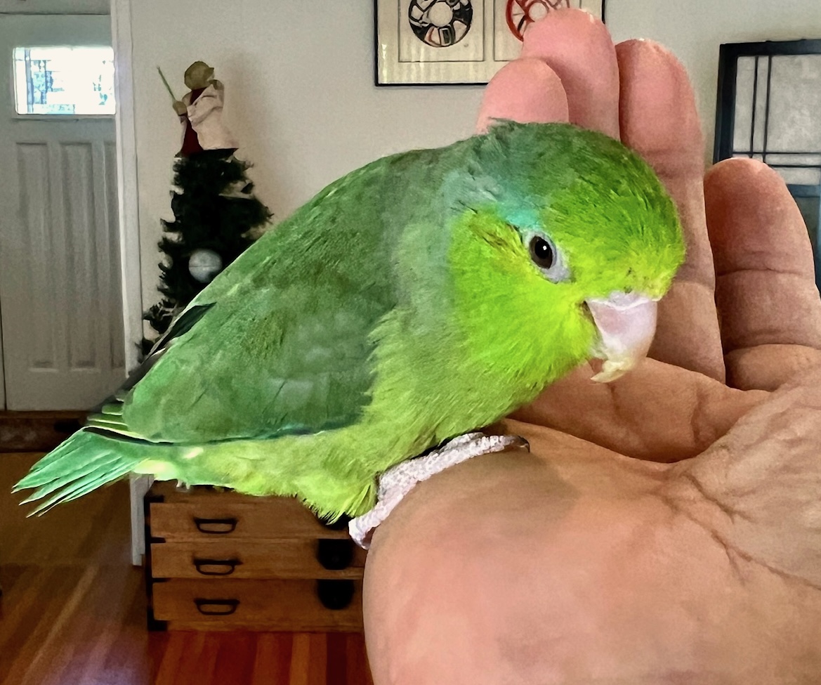 UPDATE June 2024: After her latest test results, she is continuing to take medication with a recheck scheduled for February 2024. While not yet finger trained, she can fly out of her cage and back and when handled closely, she does not struggle or bite like most parrotlets. Phew! Her current foster is very optimistic that with continued support, Ms. Green has the potential to be a tame and friendly birdie. Angels for Mrs Green |
